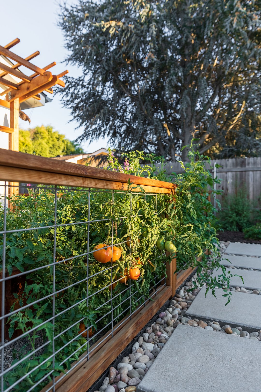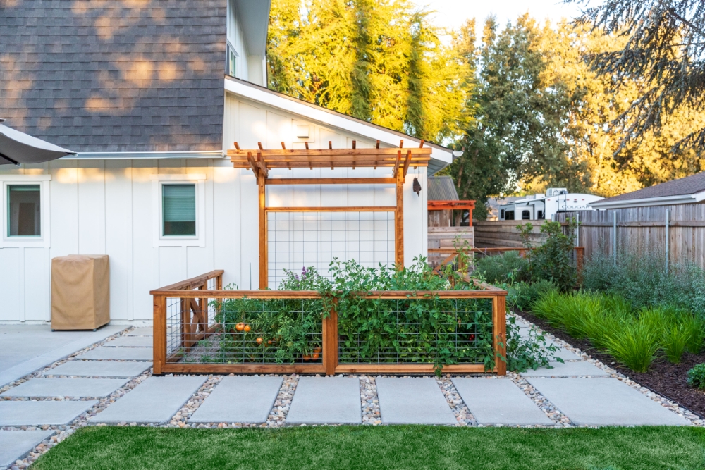 The clients wanted a unique and attractive garden bed, so we constructed it using all redwood timbers. They wanted something more distinctive than a standard garden, so we worked with them to design an enclosed see-through fence with an arbor backdrop. This doubled as a trellis suitable for an espalier fruit tree or climbing vegetables.