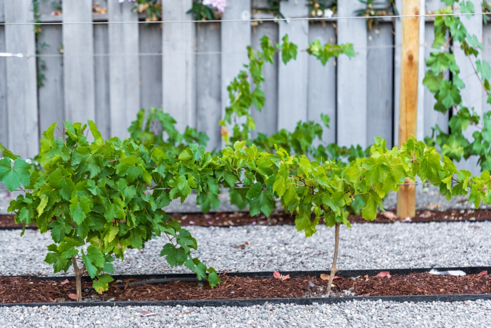 Being wine enthusiasts, they also wanted a small vineyard element incorporated into the property. We planted two rows of vineyard grapes along the front yard driveway, selecting a variety that could be used for either winemaking or table grapes.
