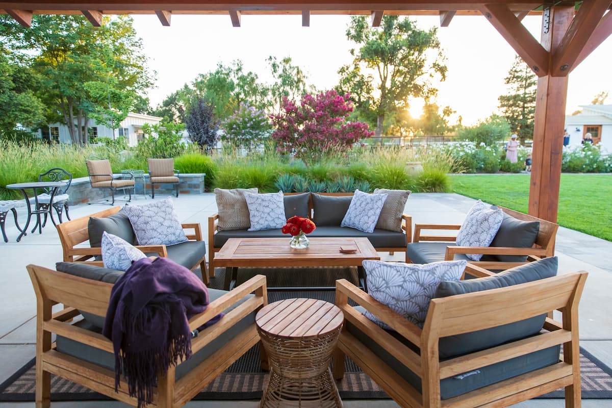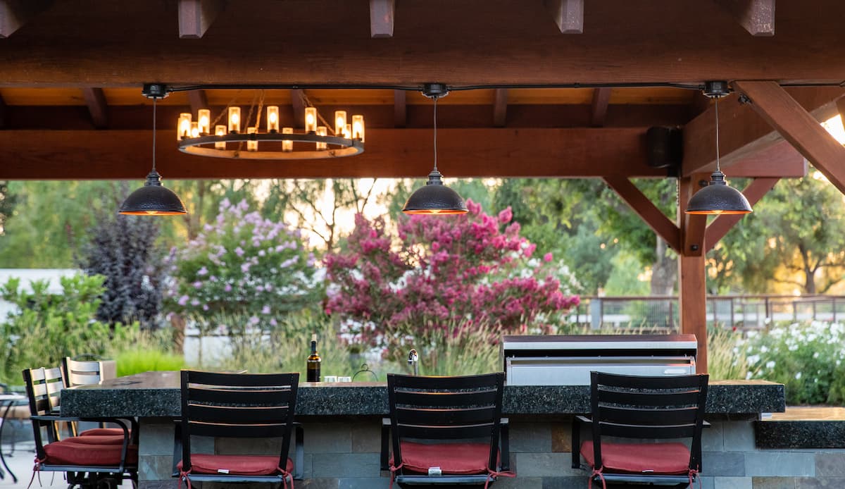 - Outdoor living under 70-year-old olive trees (Vecchio Trees) in Arroyo Grande featuring bistro and FX Luminaire lighting